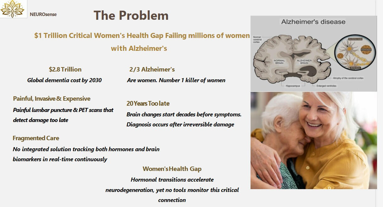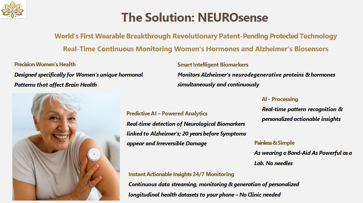 Imagine knowing you could prevent Alzheimer's Disease or dementia—20+ years before symptoms steal yours or your loved ones' memories, your independence or your future.Today, 1 in 3 Women will develop dementia in their lifetime, and by the time symptoms appear, it’s often too late for meaningful intervention. Two out of 3 Alzheimer's sufferers are women.Alzheimer's disease is now the No.1 killer of All Women.But what if we could change that?The World's FIRST breakthrough revolutionary solution, NEUROsense, is the World's Paradigm Shift for Women's Health for lifelong hormonal and cognitive care.NEUROsense is the World's FIRST wearable Intelligent Real-Time Continuous Monitoring biosensors, powered by Predictive AI Platform for the Detection, Prevention and Management of Alzheimer's many years in advance of irreversible damages and symptoms.NEUROsense detects biomarkers for Alzheimer’s Disease and other dementias at their earliest stages, empowering women to take control of their brain health before it’s too late.How It Works:Simply Apply & Forget: Ultra-thin, as painless as a Band-Aid, discrete biosensor seamlessly integrates with your daily routineYour Body Speaks, We Listen: Advanced sensors capture your hormone story as it unfolds, 24/7Decode What Your Body Is Telling You: AI-powered insights transform complex data into clear, actionable guidanceUnlock Your Potential: Make informed decisions that align with your body's natural rhythms and needs
