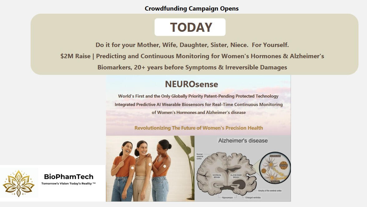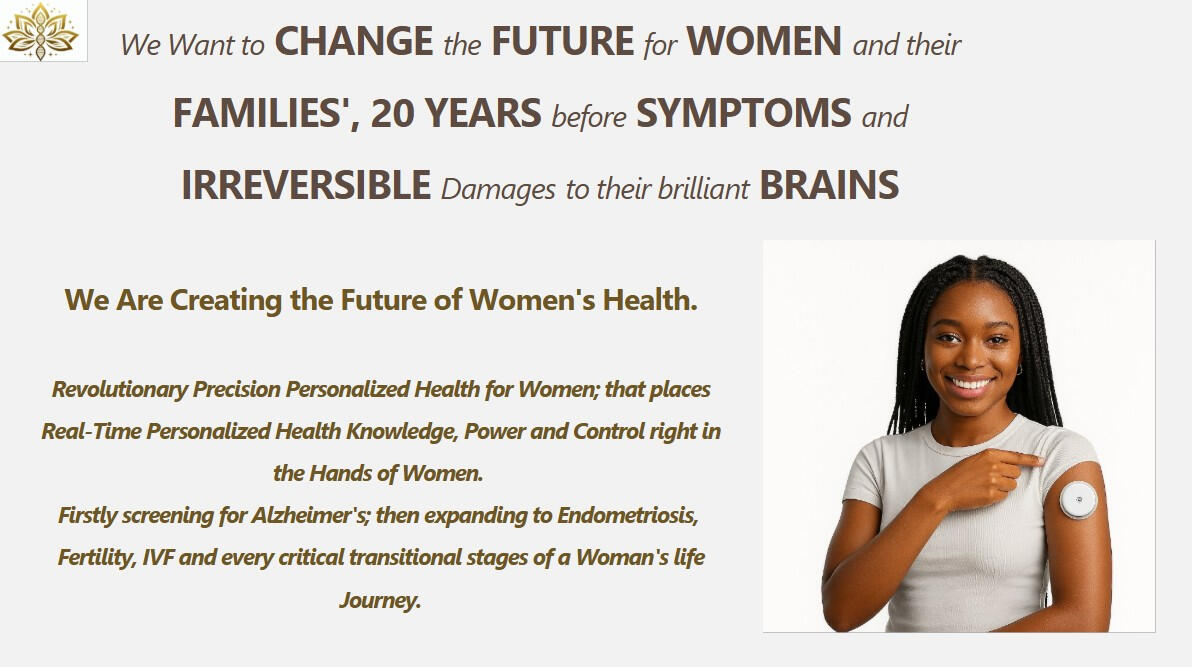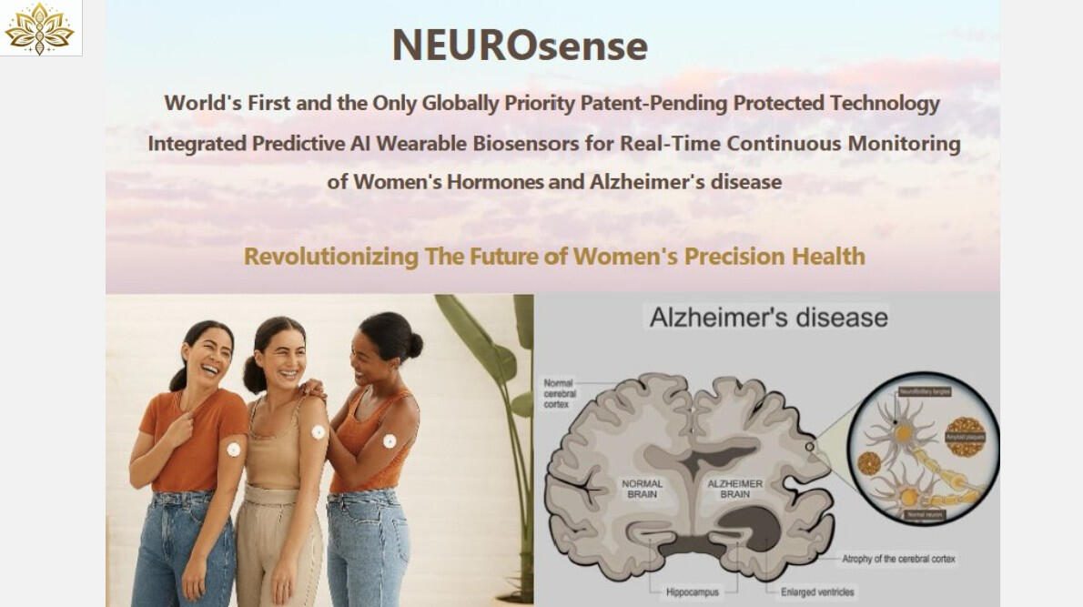 Imagine knowing you could prevent Alzheimer's Disease or dementia—20+ years before symptoms steal yours or your loved ones' memories, your independence or your future.Today, 1 in 3 Women will develop dementia in their lifetime, and by the time symptoms appear, it’s often too late for meaningful intervention. Two out of 3 Alzheimer's sufferers are women.Alzheimer's disease is now the No.1 killer of All Women.But what if we could change that?The World's FIRST breakthrough revolutionary solution, NEUROsense, is the World's Paradigm Shift for Women's Health for lifelong hormonal and cognitive care.NEUROsense is the World's FIRST wearable Intelligent Real-Time Continuous Monitoring biosensors, powered by Predictive AI Platform for the Detection, Prevention and Management of Alzheimer's many years in advance of irreversible damages and symptoms.NEUROsense detects biomarkers for Alzheimer’s Disease and other dementias at their earliest stages, empowering women to take control of their brain health before it’s too late.How It Works:Simply Apply & Forget: Ultra-thin, as painless as a Band-Aid, discrete biosensor seamlessly integrates with your daily routineYour Body Speaks, We Listen: Advanced sensors capture your hormone story as it unfolds, 24/7Decode What Your Body Is Telling You: AI-powered insights transform complex data into clear, actionable guidanceUnlock Your Potential: Make informed decisions that align with your body's natural rhythms and needs